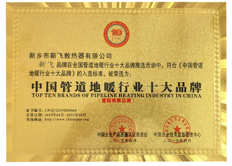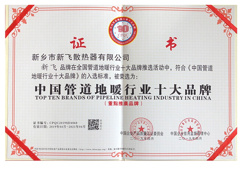 經(jīng)中國企業(yè)產(chǎn)品質量認證委員會和中國企業(yè)信用監(jiān)督中心的綜合評審。從品牌價值、售后服務、市場飽有量,產(chǎn)品質量等。認定新飛散熱器有限公司生產(chǎn)的地暖管,PPR管等產(chǎn)品符合有關條件。認證為中國管道地暖行業(yè)十大品牌!